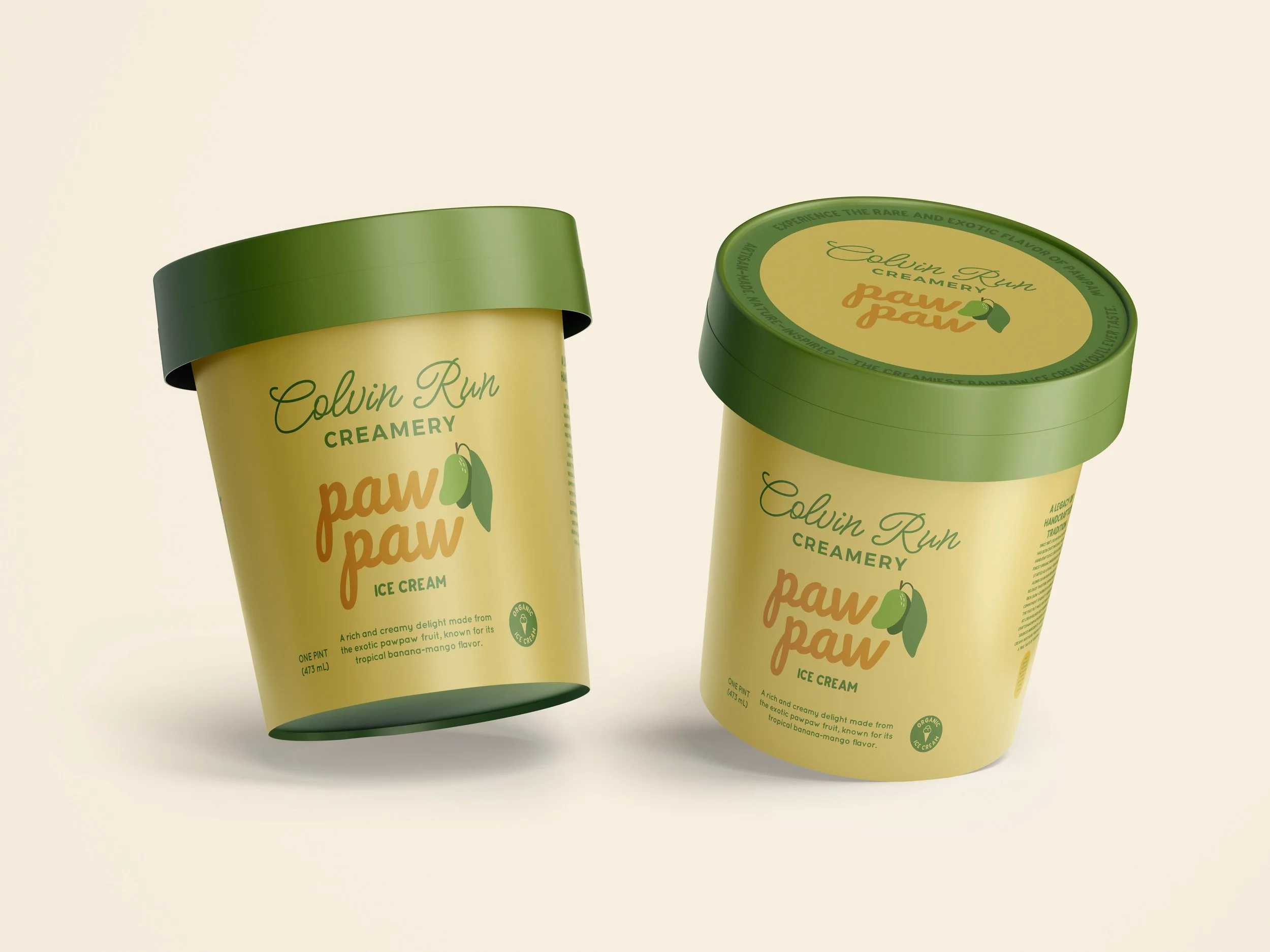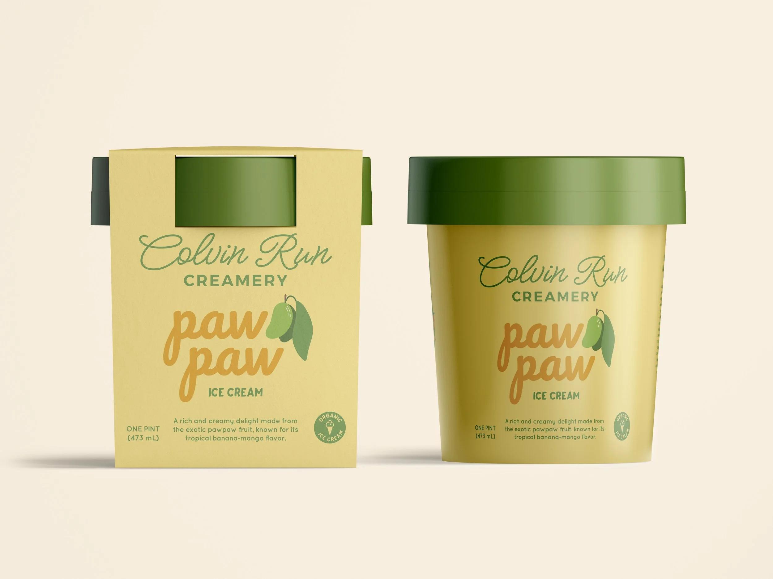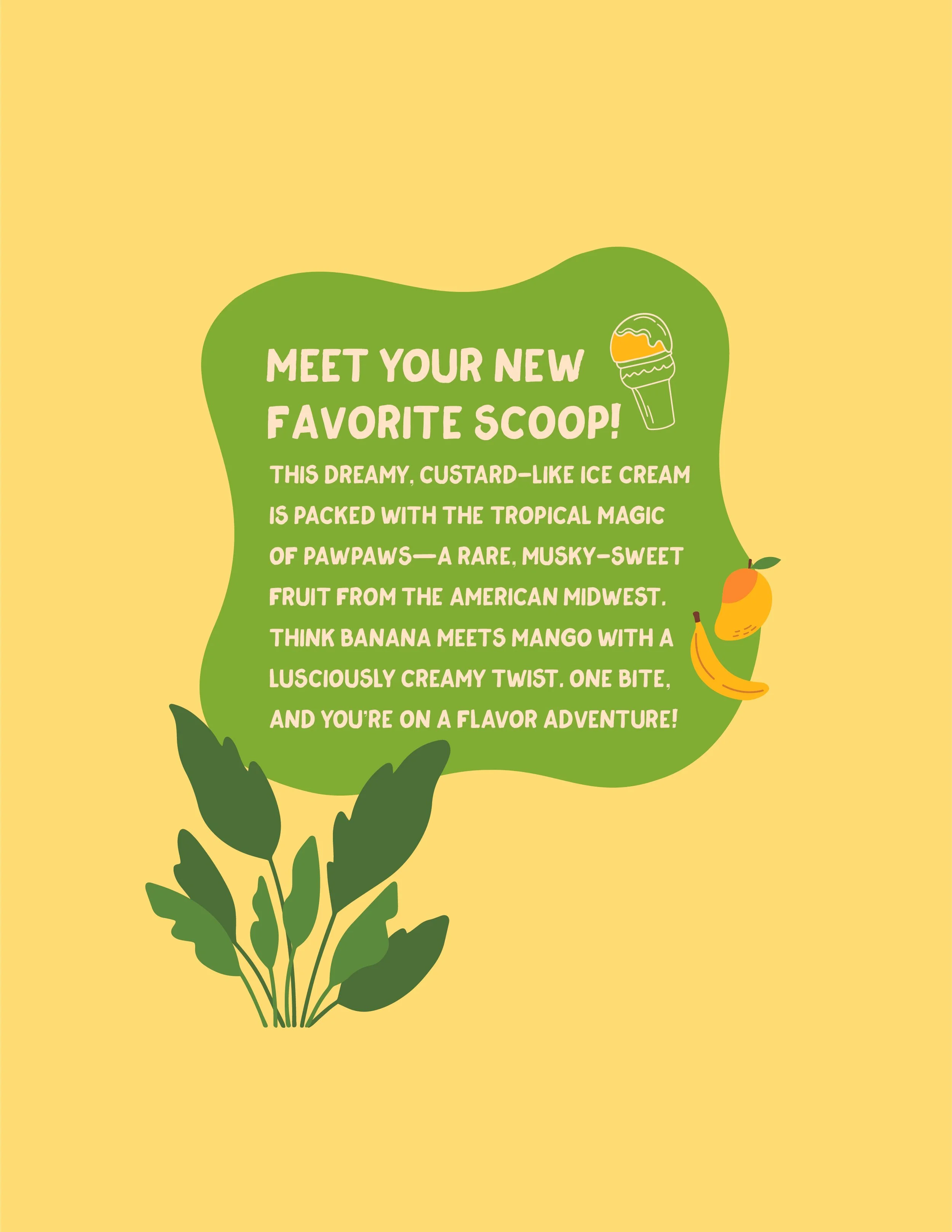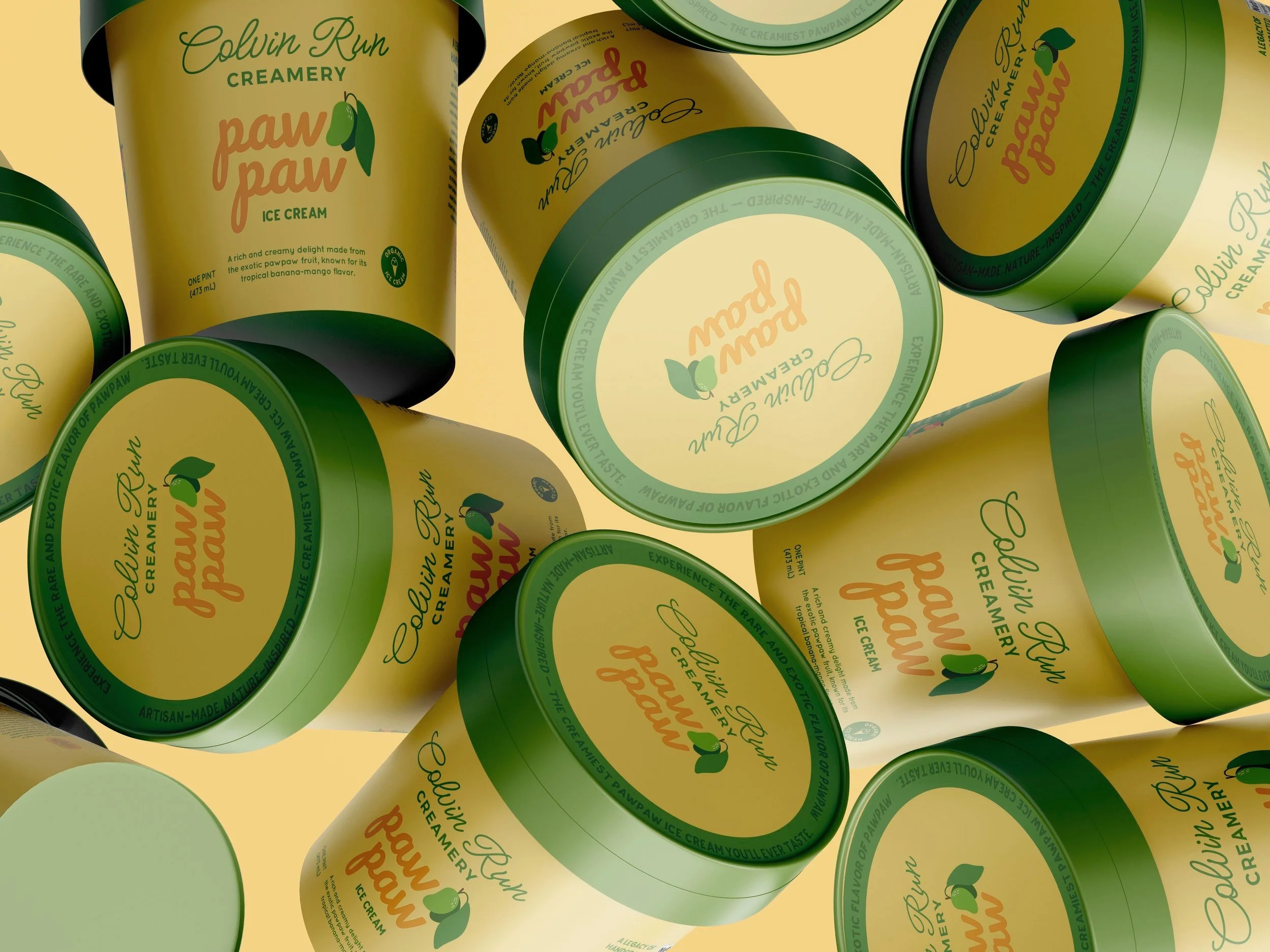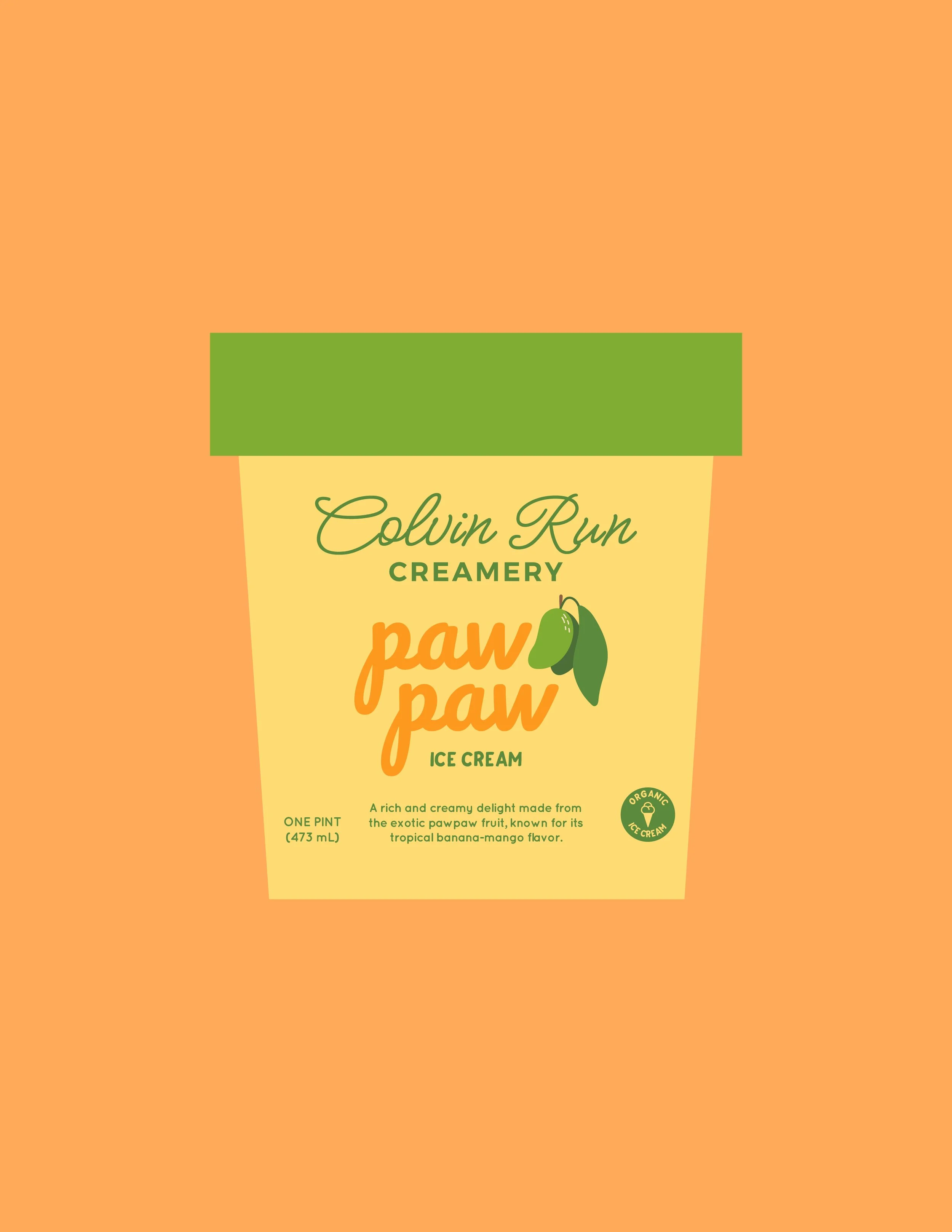 Colvin Run Creamery’s new pawpaw ice cream celebrates a unique, tropical-like fruit native to North America. The label design process focused on capturing the pawpaw’s rich, custard-like flavor and vibrant colors while staying true to the creamery’s handcrafted, small-batch identity.