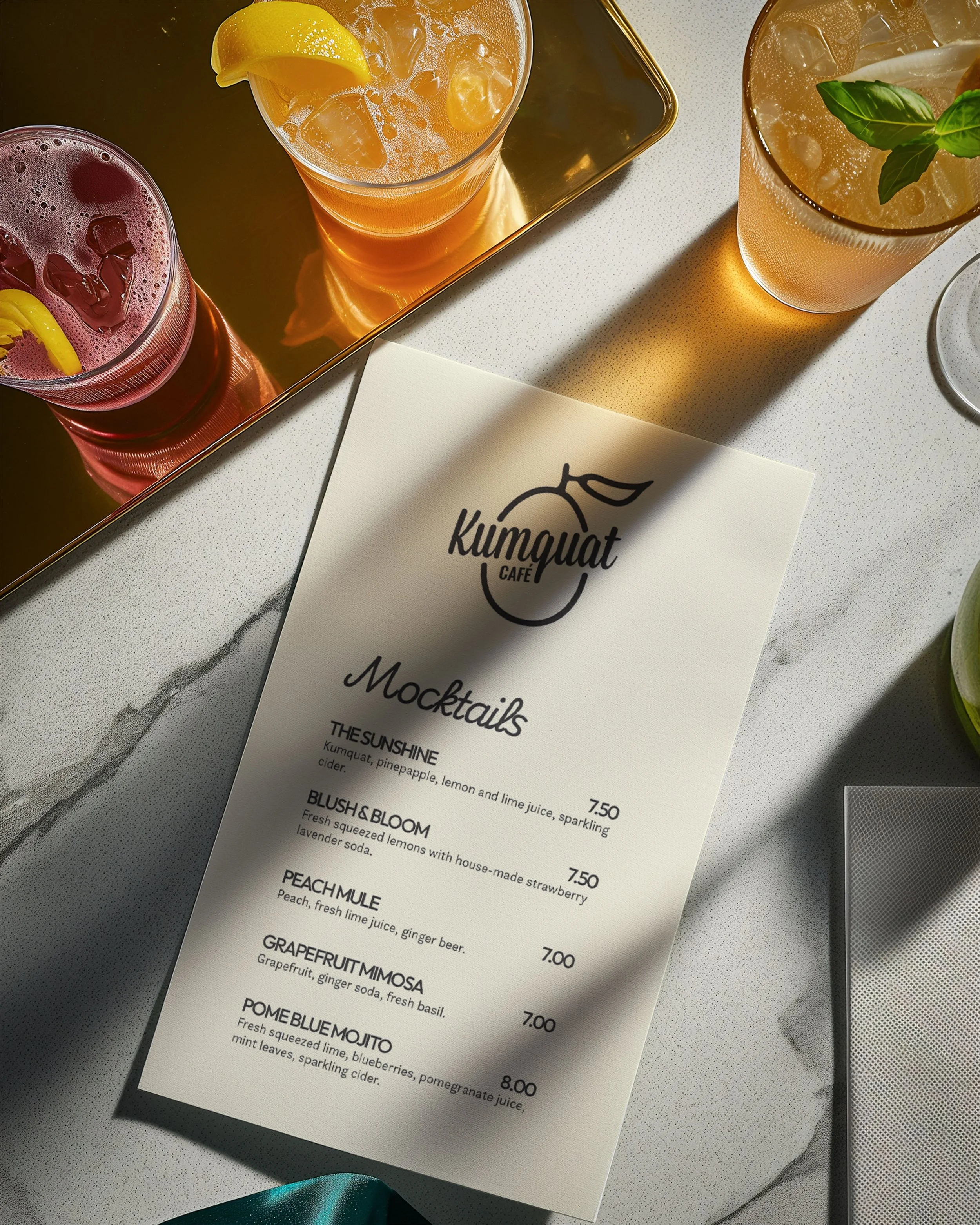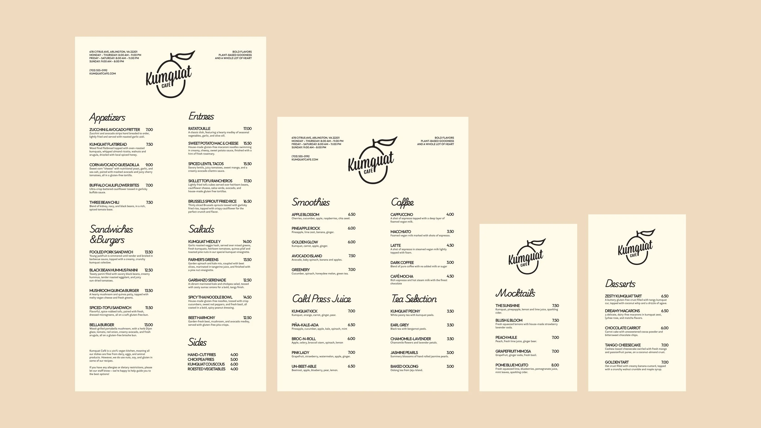 Kumquat Café is a vibrant vegan café offering a thoughtfully crafted, plant-based menu that highlights seasonal, fresh ingredients and bold flavors. Designed to be a welcoming and comfortable space, Kumquat Café invites guests to relax and enjoy everything from nourishing meals to handcrafted mocktails, fresh juices, and specialty coffee. The menu is rooted in quality and creativity, offering a modern twist on wholesome, plant-based dining. The branding project focused on developing a distinctive logo and a thoughtfully designed menu, both of which embody the café’s commitment to fresh, plant-based dining and a clean, contemporary aesthetic.