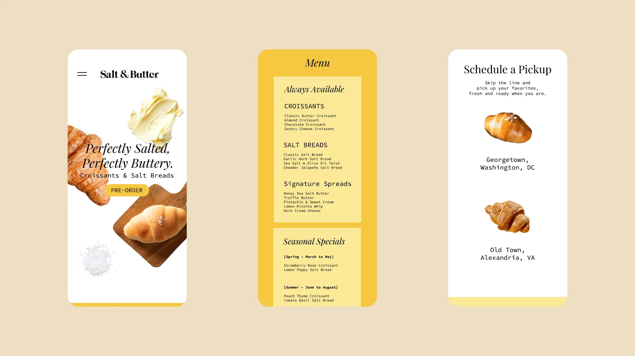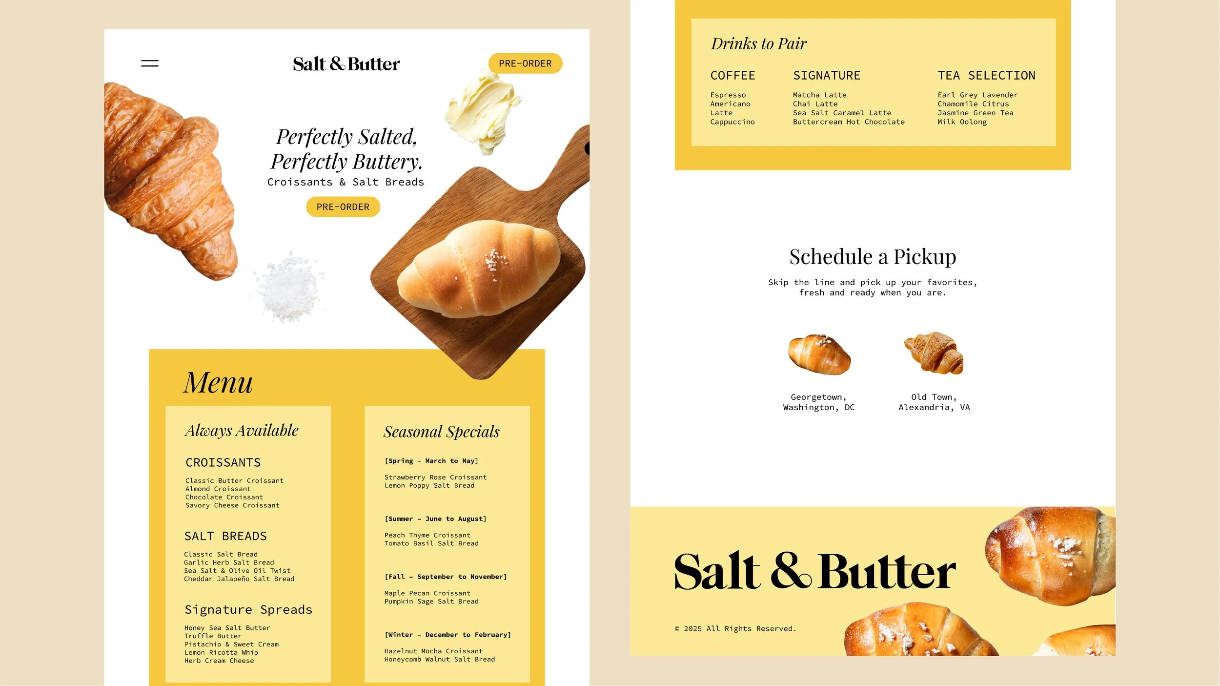 Salt & Butter is a small-batch bakery specializing in croissants and salt breads, with a curated selection of drinks and house-made spreads designed to complement each bake. The brand is rooted in quiet quality: thoughtful, unfussy, and timeless.
